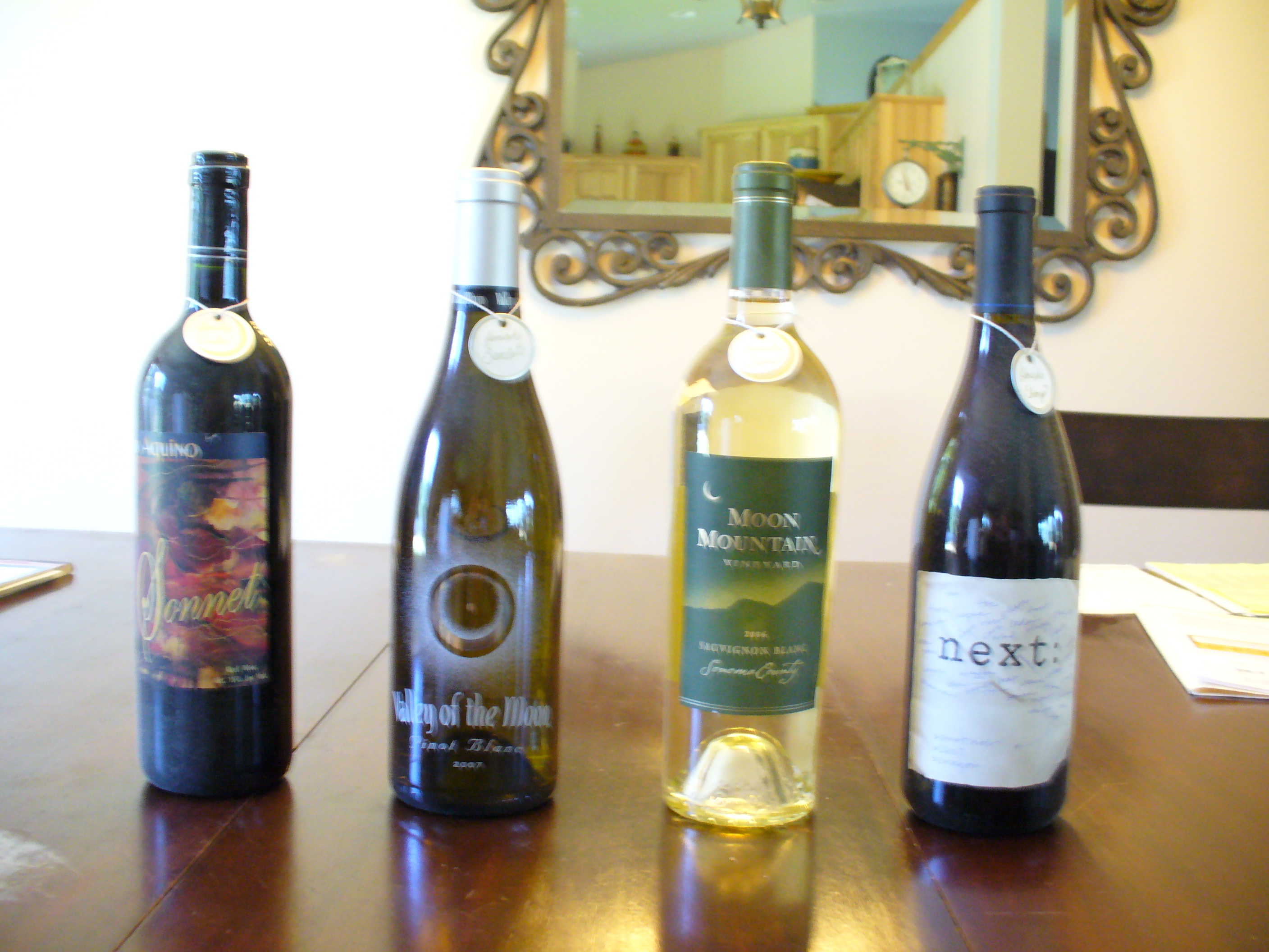 These four are for finishing the Lunar Chronicles. In order: Cinder, Scarlet, Cress, Ebony. I know the picture is blurry, but they are, in order: Sonnet (red table wine), Valley of the Moon (pinot blanc), Moon Mountain (sauvignon blanc), and Next: (pinot noir). Notice the moon theme, and the label on the last bottle which is like a brainstorming cluster. How awesome is that?