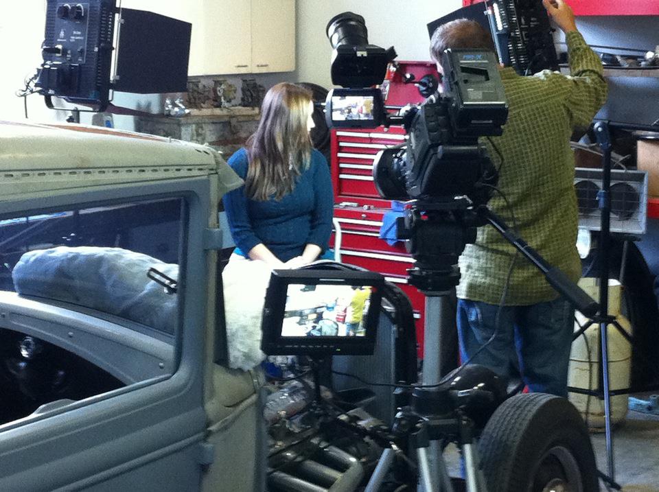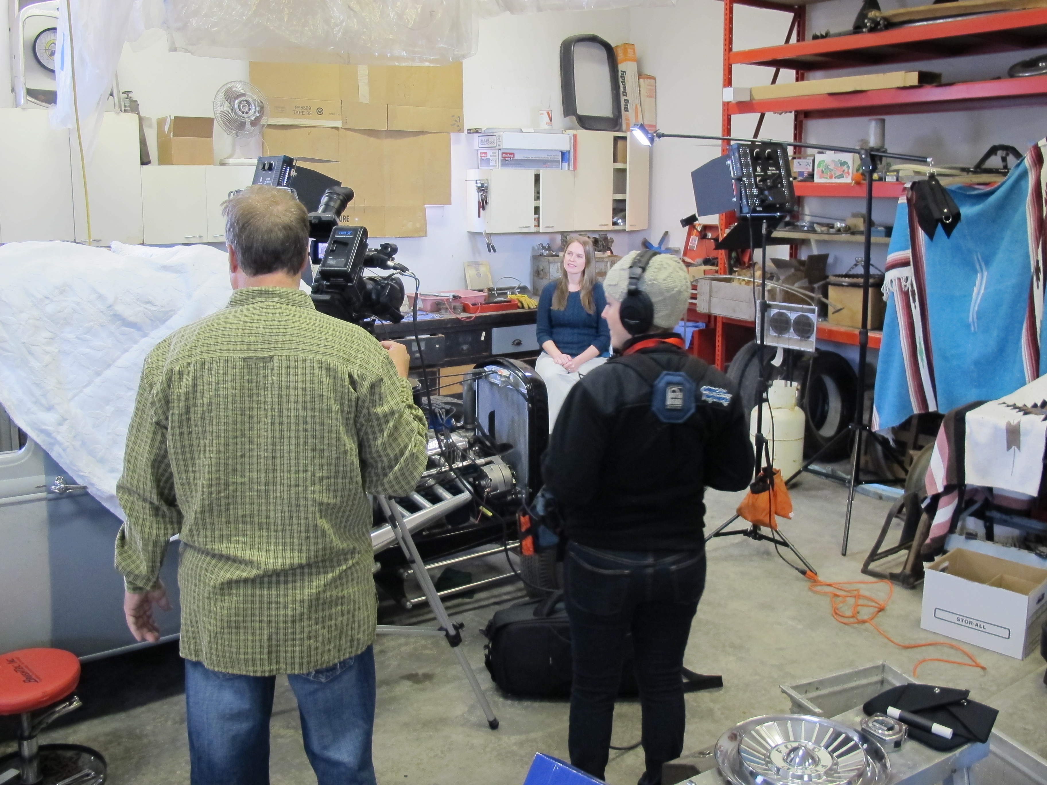 Then they put me on a stool amid all the tools and car parts and asked me questions about the book and I answered them. The hardest part for me is trying to act natural when you’re under spotlights and staring at a camera in your freezing cold garage, oy. But the director said I did a good job, so I hope it turns out well when it’s all edited!